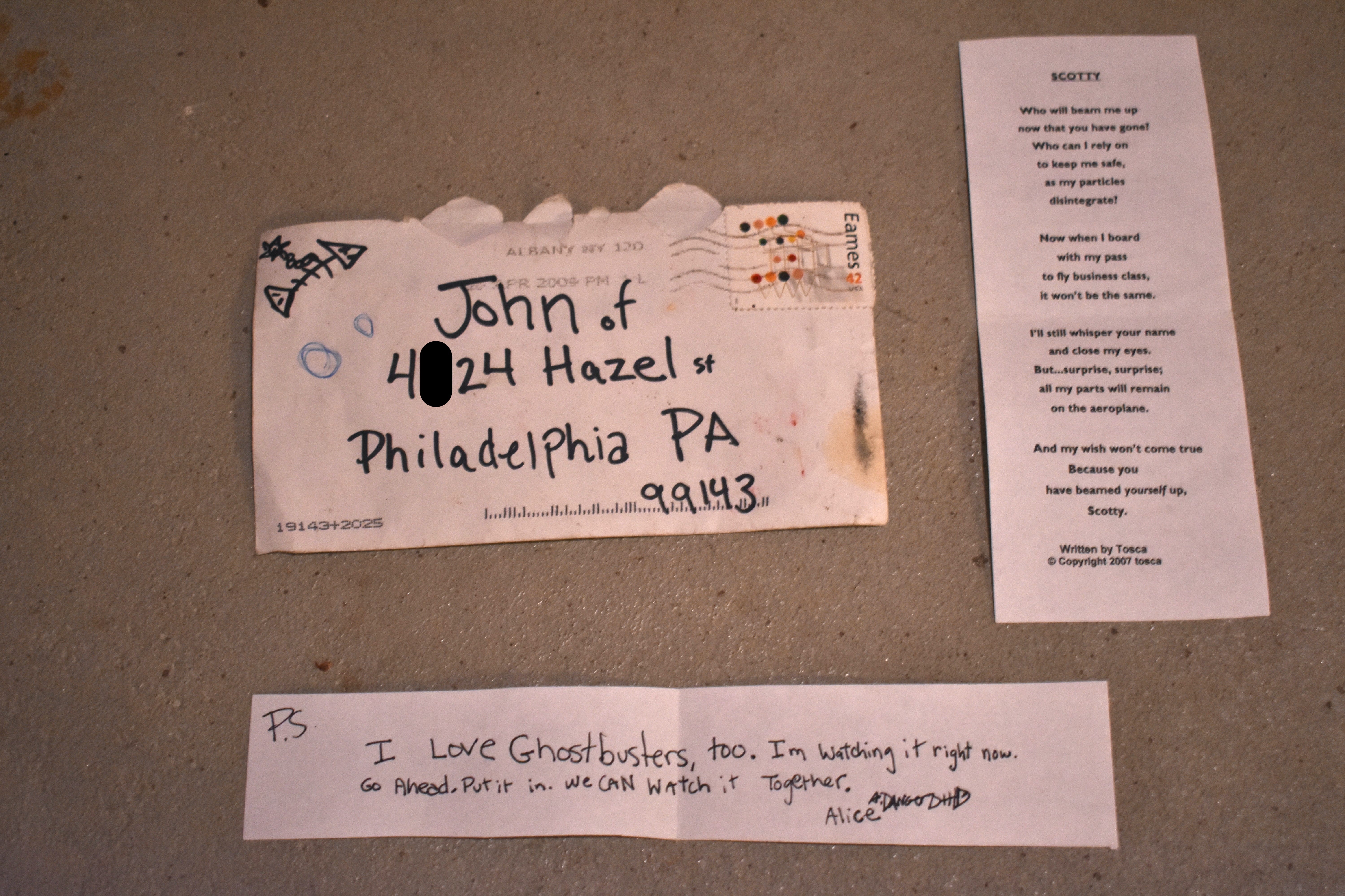 On a scrap of paper in an envelope addressed to John was a handwritten note which said, “P.S. I love Ghostbusters, too. I'm watching it right now. Go ahead. Put it in. We can watch it together. -Alice” and then next to that “A. Danger” with a little drawing of the skeleton of a fish. It also includes a poem about someone asking Scotty to beam them up, but Scotty has already beamed himself up.