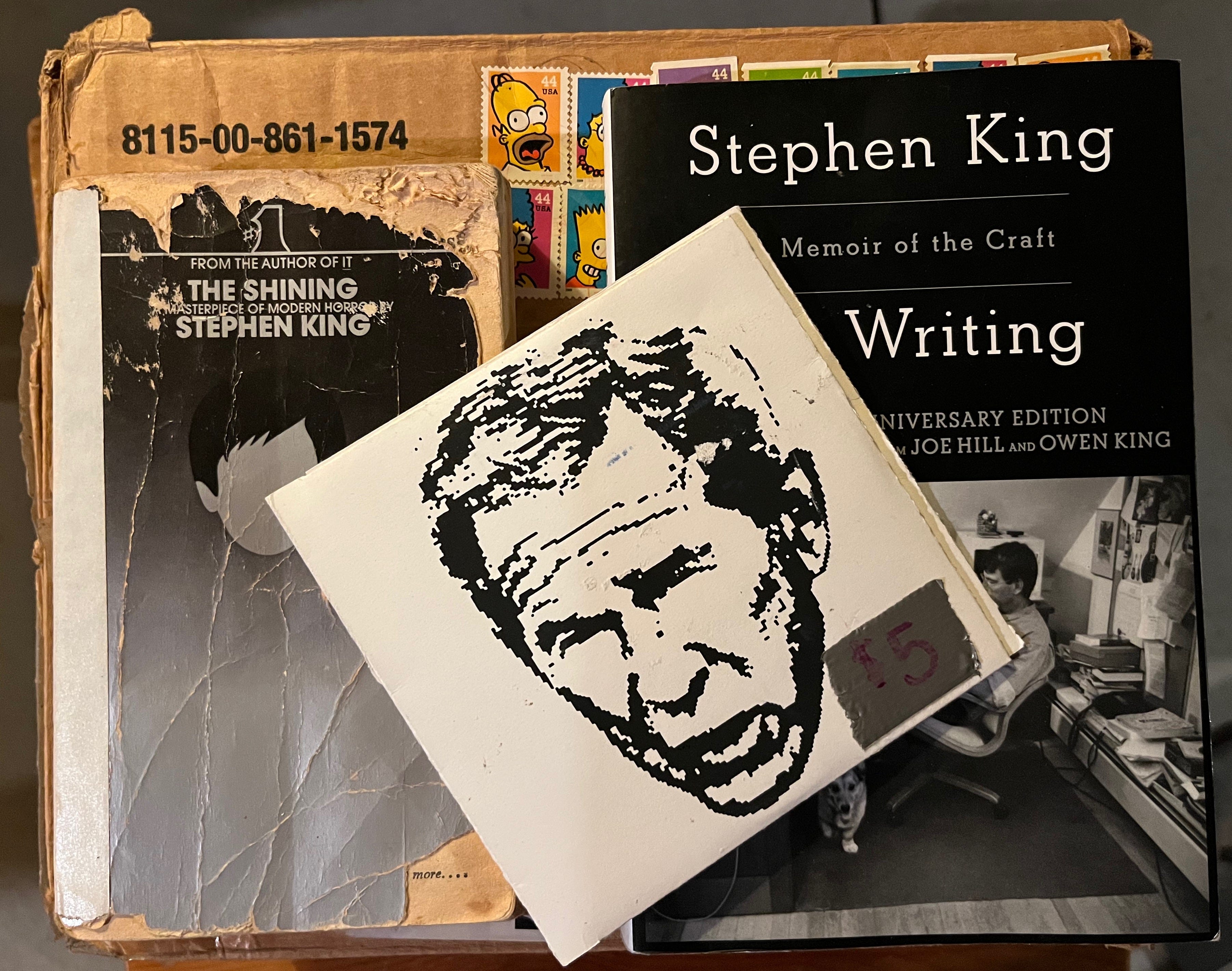 I had also had the idea to mash together lines from The Simpsons parody of The Shining—particularly “No beer and no TV make Homer something something…” “Go crazy?” “Don’t mind if I do!” and “The Shinnin’” “You mean, the Shining?” “Shh! You want to get sued, boy?”—with lines from On Writing about writing The Shining. And of course, I wanted to reread The Shining because I hadn’t read it in a long time. There were no available copies at the libraries, so I asked my mom to mail me the copy the I had at home.