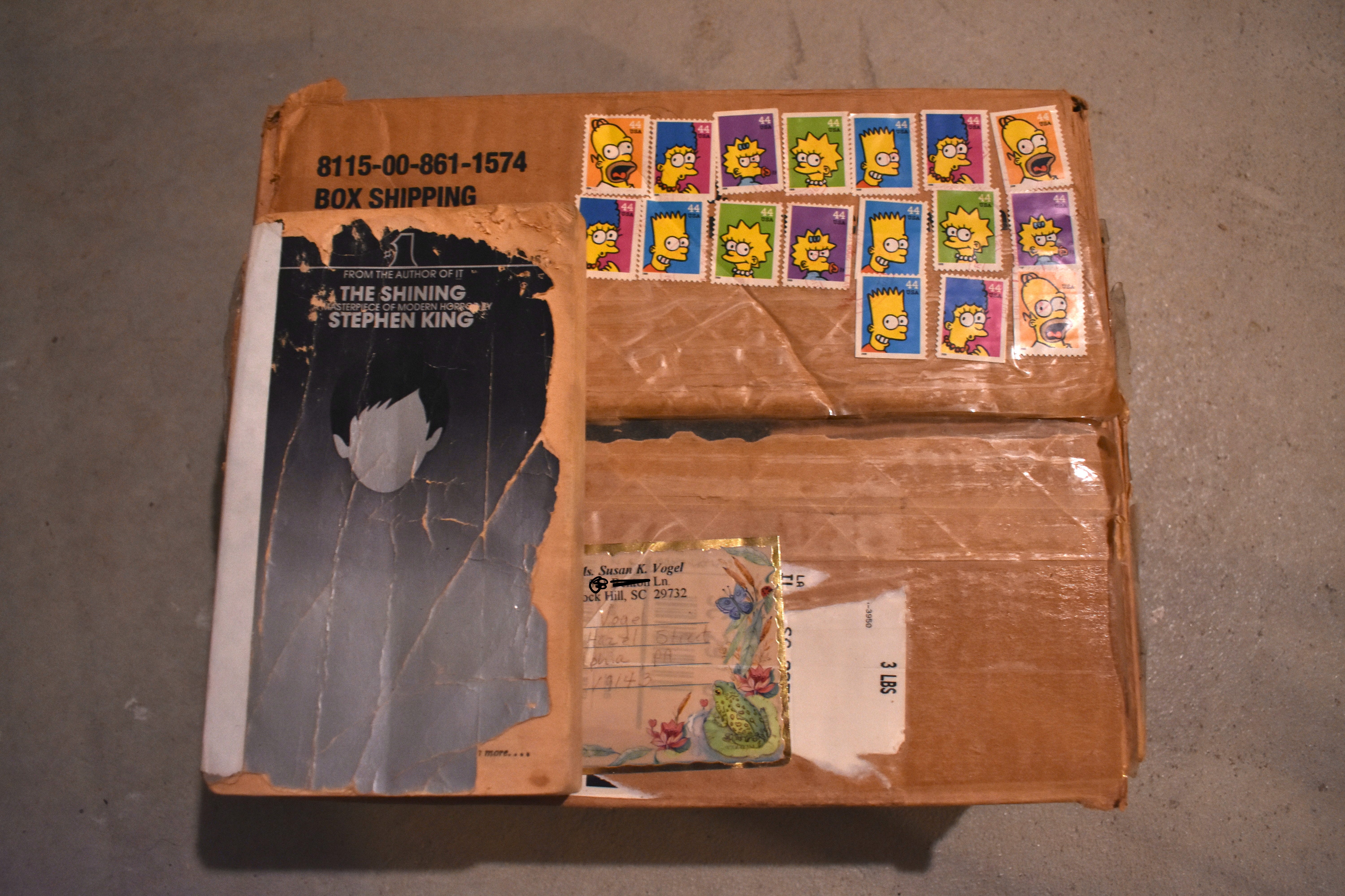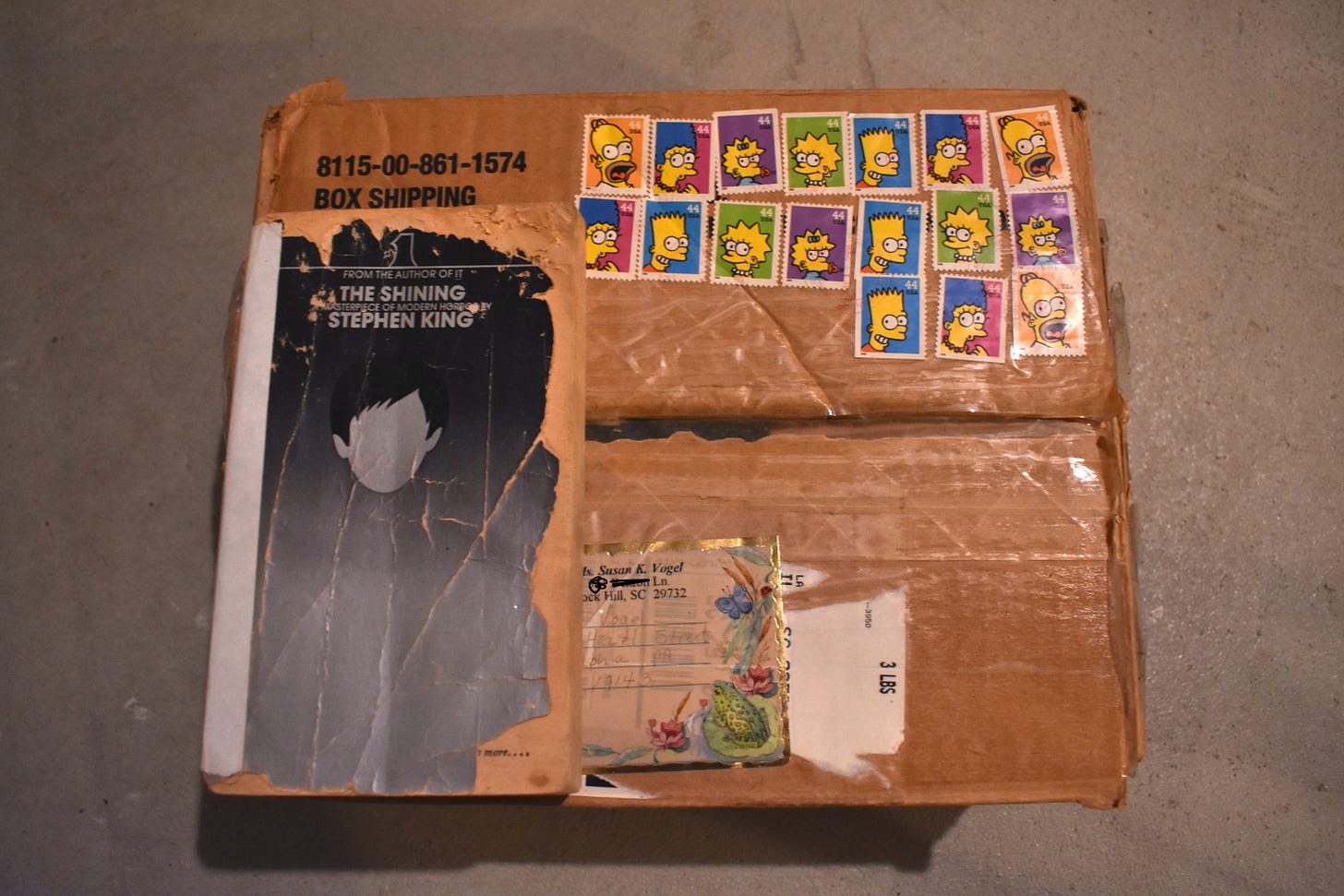 When the box arrived, my mom had placed seventeen Simpsons stamps in the upper right-hand corner of the package. I stood there and stared at the box. Full of magical feeling, my mind got stuck in a loop: “Coincidence!” “Significance!”